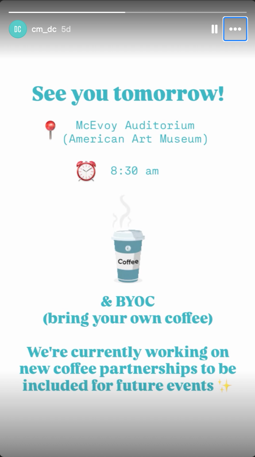 Social media work for Creative Mornings. IG Stories help reach people who might miss posts on their Timeline. Not only did this event have high turnout, we also received messages from people wanting to connect us with coffee partnerships.